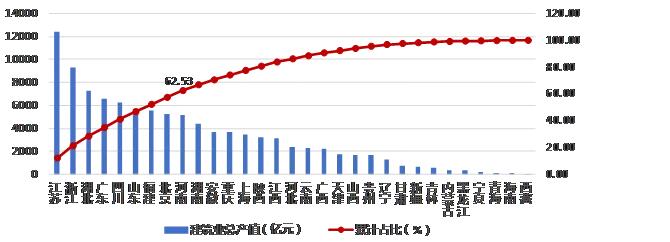 2019 年上半年,江苏、浙江两省依然领跑全国各地区建筑业,建筑业总产值分别达到 12438.98 亿元、9291.17亿元,两省共占全国建筑业总产值的 21.38%。除江苏、浙江两省外,总产值超过 5000 亿元的还有湖北、广东、四川、山东、福建、北京和河南7 个地区,上述 9省市完成的建筑业总产值占全国建筑业总产值的 62.53%(图 1)。
