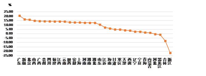从各地区建筑业总产值增长情况看,有 27 个地区的建筑业总产值较上年同期有不同幅度的增长。其中,广东、新疆、北京的增幅均超过 15%。有 4个地区出现负增长,其中,浙江出现了 超过20% 的负增长(图 2)。
