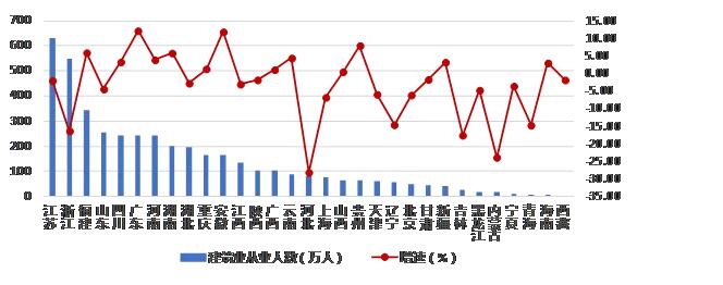 2019 年上半年,全国建筑业从业人数超过百万的地区共 14个。江苏、浙江依然是从业人数大省,人数分别达到630.67 万人和 550.40万人。福建、山东、四川、广东、河南、湖南等6个地区从业人数均超过200万人。与上年同期相比,13 个地区的从业人数增加,其中,增加人数最多的是广东,增加 26.48万人 ;18 个地区的从业人数减少,其中,减少最多的是浙江,减少107.64万人。从业人数增幅******的是广东和安徽,分别为 12.15%和11.86%;降幅******的是河北和内蒙古,分别下降了 28.15%和23.89%(图 5)。
