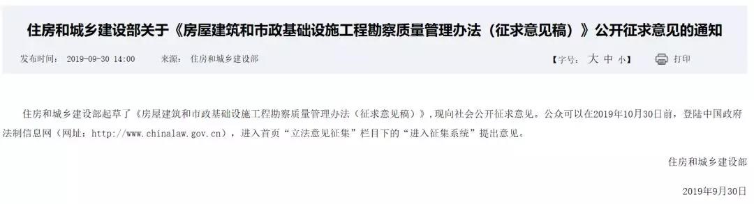 住房和城乡建设部起草了《房屋建筑和市政基础设施工程勘察质量管理办法(征求意见稿)》,现向社会公开征求意见。公众可以在2019年10月30日前,登陆中国政府法制信息网(网址:http://www.chinalaw.gov.cn),进入首页“立法意见征集”栏目下的“进入征集系统”提出意见。住房和城乡建设部2019年9月30日《房屋建筑和市政基础设施工程勘察质量管理办法(征求意见稿)》第一章 总则第一条 为了加强对房屋建筑和市政基础设施工程勘察质量的管理,保证工程勘察质量,根据《中华人民共和国建筑法》《建设工程勘察设计管理条例》《建设工程质量管理条例》《建设工程安全生产管理条例》等有关法律、法规,制定本办法。第二条 在中华人民共和国境内从事房屋建筑和市政基础设施工程(以下简称“工程”)勘察活动的,应遵守本办法。本办法所称勘察,是指根据工程要求,查明、分析、评价建设场地的地质、环境特征和岩土工程条件,并提出合理技术建议,编制工程勘察文件的活动。本办法所称工程勘察文件,主要包括勘察纲要、勘察报告等文件。第三条 建设单位、勘察单位及相关人员应依法对工程勘察质量负责。第四条 国务院住房和城乡建设主管部门负责全国工程勘察质量活动的监督管理。县级以上地方人民政府住房和城乡建设主管部门对本行政区域内的工程勘察质量实施监督管理。第五条 工程勘察行业相关社会团体应完善行业约束与惩戒机制,加强行业自律,维护公平竞争,规范勘察单位和人员依法从事工程勘察活动。第六条 鼓励采用先进技术、工艺、设备、材料和管理方法,提高工程勘察质量水平。第二章 责任和义务第七条 建设单位应依法与勘察单位签订勘察合同,明确勘察任务要求、工期、费用以及各自的质量责任义务。第八条 建设单位应为勘察工作提供必要的现场工作条件。在勘察工作开展前,提供有关批准文件,勘察场地地形图、地下管线及设施分布图等与工程勘察有关的前期资料,并对资料的真实性、准确性、完整性负责。第九条 建设单位应加强履约管理,及时足额支付勘察费用。建设单位可委托具有勘察资质的第三方单位提供勘察质量管理服务。建设单位应按规定将工程勘察文件送施工图审查机构审查。建设单位应组织勘察单位向设计单位、施工单位和监理单位进行勘察技术交底。在基坑隐蔽前及时组织勘察单位、设计单位、施工单位、监理单位等开展施工验槽。第十条 勘察单位必须依法取得工程勘察资质证书,并在资质等级许可的范围内承接勘察业务。勘察单位应按照有关法律法规、工程建设强制性标准、勘察合同及勘察任务要求开展勘察工作,编制工程勘察文件,并对工程勘察文件的真实性、准确性和完整性负责。工程勘察文件的编制深度应符合国家规定的要求。第十一条 勘察单位应按照有关规定,建立健全勘察质量管理制度并确保有效运行。第十二条 勘察单位有权向建设单位提出保证工程勘察质量所必需的现场工作条件、合理技术要求和合理工期。第十三条 勘察单位应在勘探作业前向作业人员进行交底。勘察单位应严格执行勘察纲要和勘察操作规程,采取措施保证各类管线、设施和周边建筑物、构筑物的安全,并做好安全记录。第十四条 勘察单位应按照规范要求对试验样品的取样、密封、送样、保管、试验进行管理。第十五条 勘察单位应保证工程勘察工作原始记录的真实和准确,并应在勘察过程中及时整理、核对,严禁离开现场追记或者补记。项目负责人或其授权人员应及时对原始记录进行验收签字。鼓励勘察单位采用信息化手段,实时采集、记录、存储工程勘察数据。鼓励勘察单位采用影像等方式对钻探、取样、原位测试、室内试验等主要过程进行记录。勘察单位在原始记录中不得存在下列情形:(一)纸质原始记录与电子存储记录不一致的;(二)试验、测试报告与试验、测试的过程记录资料不符的;(三)未按规定记录原始数据的;(四)各类记录和报告的时间与原始记录和报告的时间不一致的。第十六条 勘察单位应确保勘探、取样、原位测试、室内试验及测量等仪器和设备符合有关规定。严禁使用不符合规定的仪器和设备。第十七条 勘察单位依法委托具备条件的单位承担勘探、试验、测试工作的,勘察单位对委托的勘察工作质量负责。第十八条 勘察单位应对勘察从业人员开展职业技能培训,提高勘察人员的技能水平和质量责任意识。司钻员、描述员、土工试验员等作业人员应按照有关规定接受专业培训。第十九条 勘察单位应在勘察技术交底时向设计单位、施工单位和监理单位说明工程勘察主要结论,解释工程勘察文件,并提示地质条件可能引起的风险。勘察单位应参加施工验槽,依据验槽结果提出处理建议。勘察单位应及时解决工程设计和施工中与勘察工作有关的问题。勘察单位应按规定参加工程竣工验收。第二十条 勘察单位应建立工程勘察档案管理制度。勘察工作完成后,应及时将工程勘察文件和勘探、试验、测试原始记录及成果、质量安全管理记录归档保存。保存期限应不少于工程的设计使用年限,在保存期限内不得销毁、遗弃、隐匿原始记录。鼓励实行电子化档案管理,具有法律效力的电子档案可以作为凭证使用。在确保信息安全的情况下,鼓励对既有工程勘察文件中的数据信息进行再