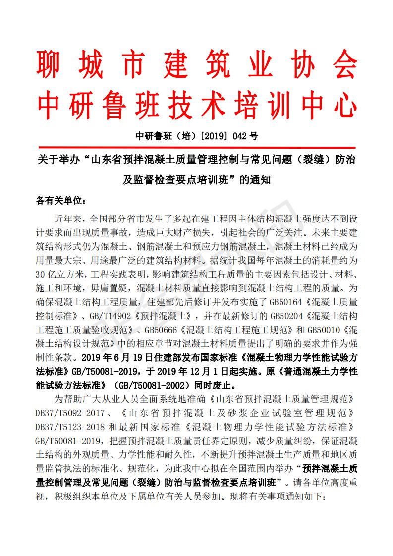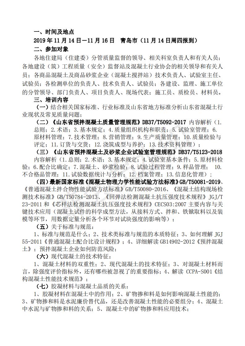 关于举办“山东省预拌混凝土质量管理控制与常见问题(裂缝)防治 及监督检查要点培训班”的通知