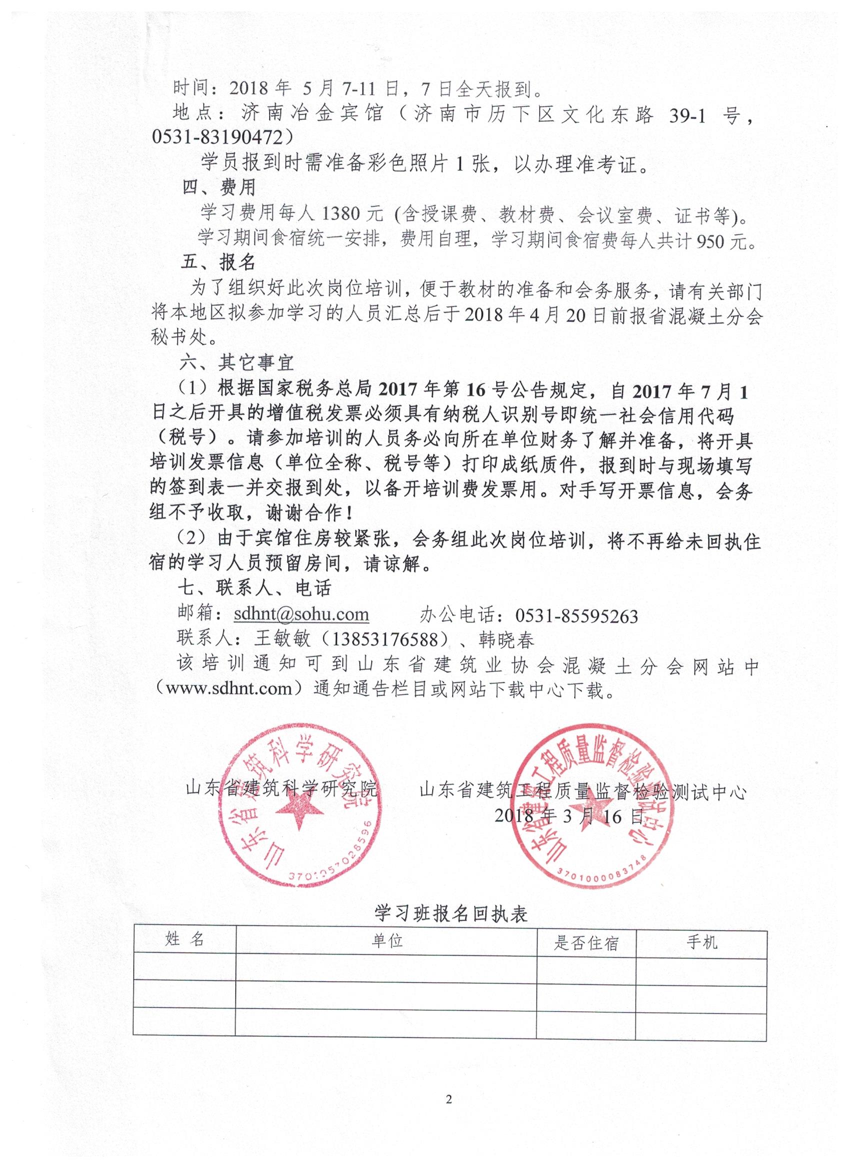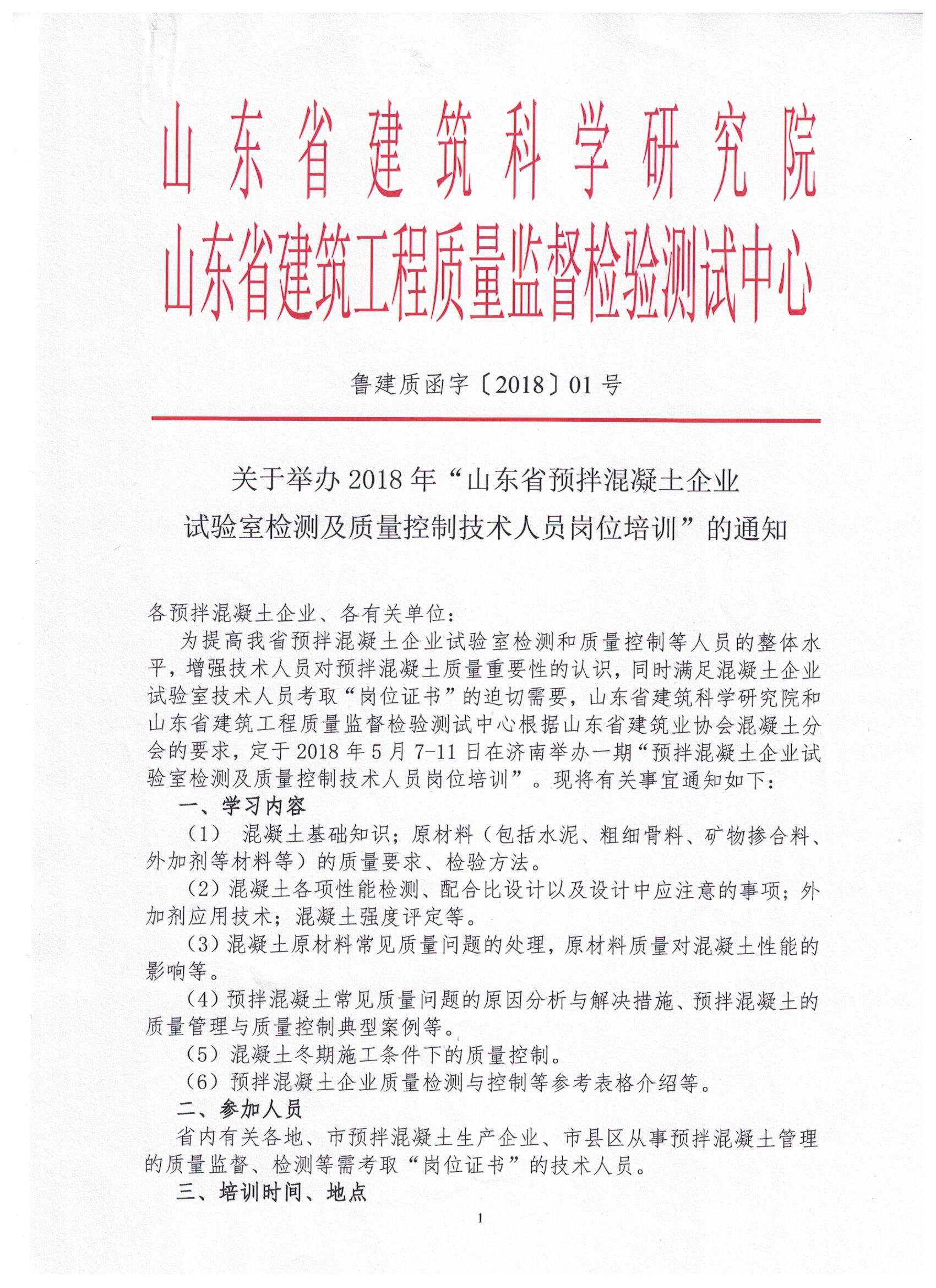 [转发]关于举办2018年“山东省预拌混凝土企业试验室检测及质量控制技术人员岗位培训”的通知